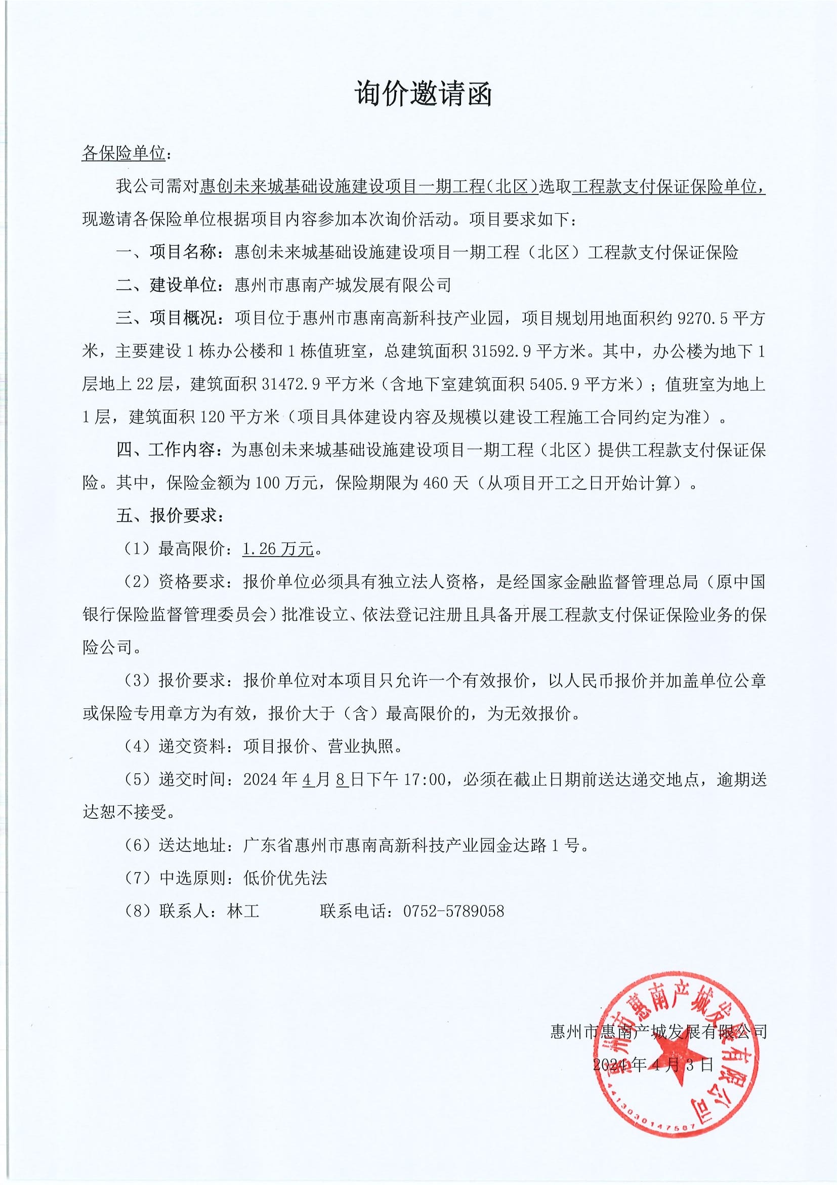 惠創(chuàng)未來城基礎設施建設項目一期工程(北區(qū))工程款支付保證保險詢價邀請函