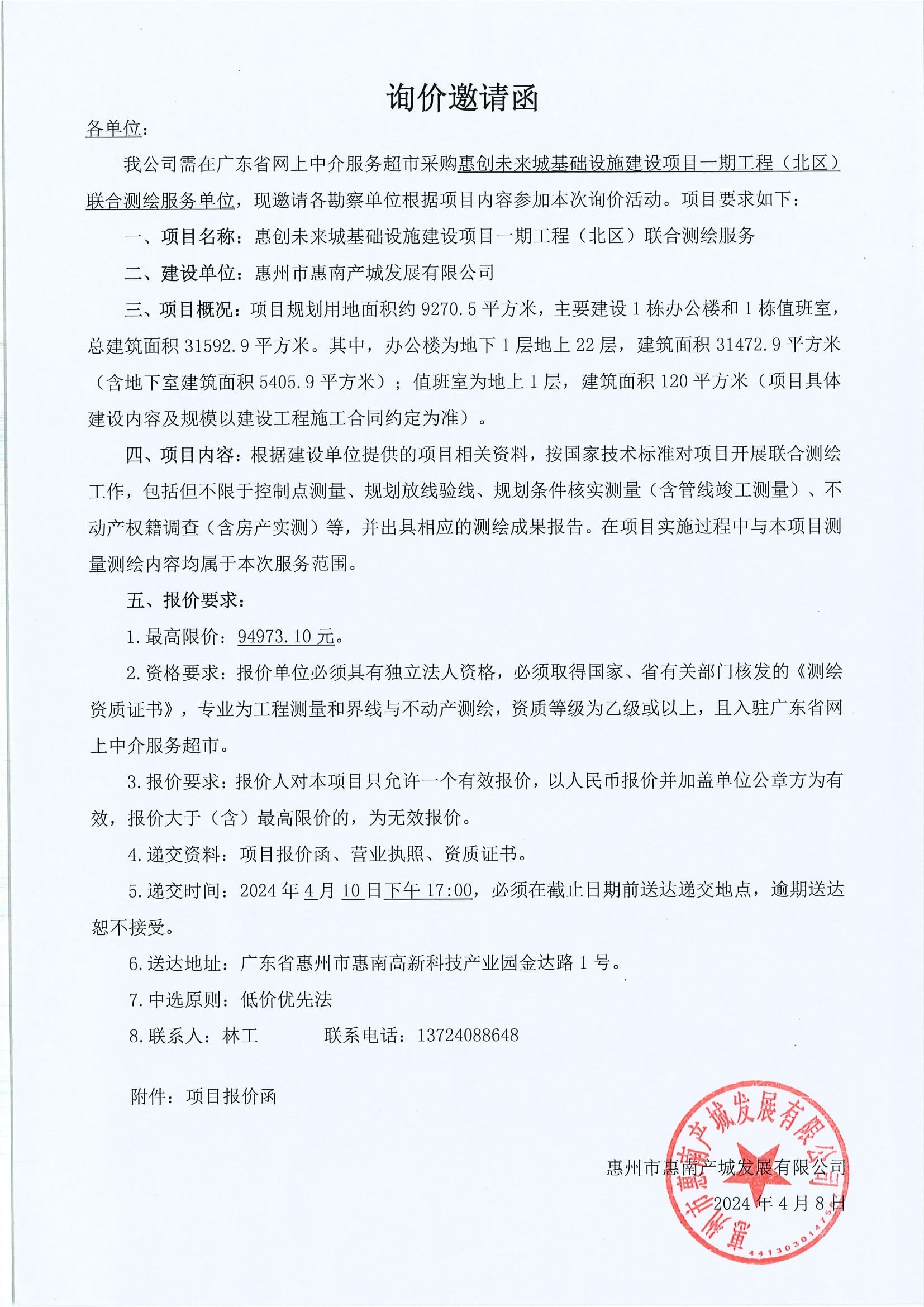 惠創(chuàng)未來城基礎(chǔ)設(shè)施建設(shè)項(xiàng)目一期工程(北區(qū))聯(lián)合測繪服務(wù)詢價(jià)邀請函