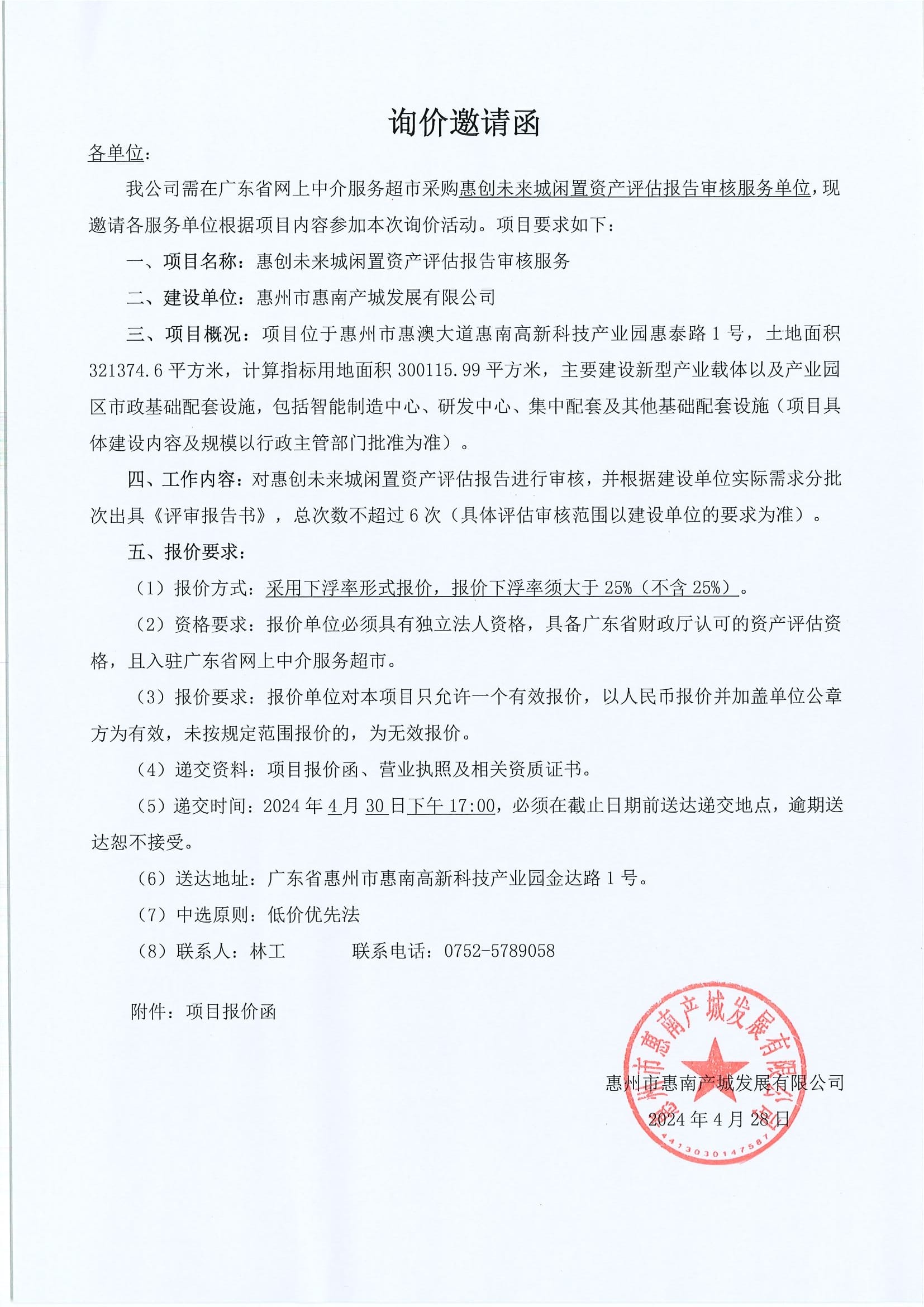 惠創(chuàng)未來城閑置資產(chǎn)評(píng)估報(bào)告審核服務(wù)詢價(jià)邀請(qǐng)函