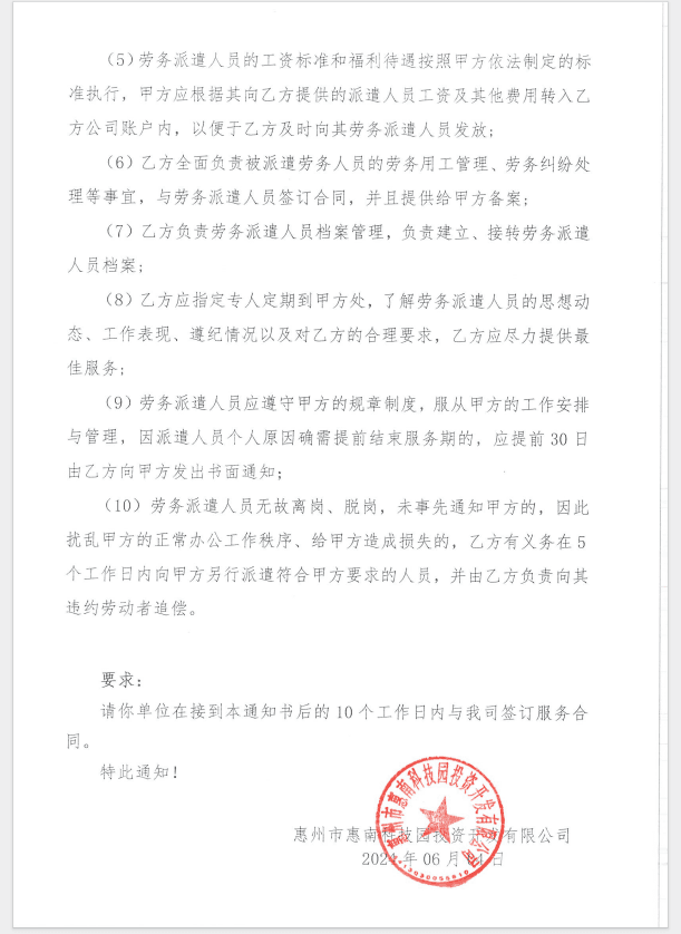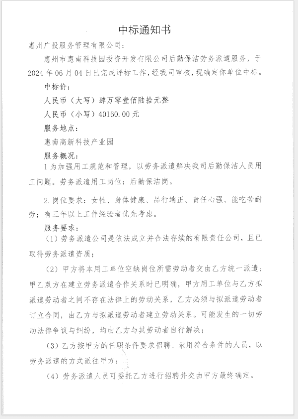 【中標(biāo)通知】惠州市惠南科技園投資開(kāi)發(fā)有限公司后勤保潔勞務(wù)派遣服務(wù)