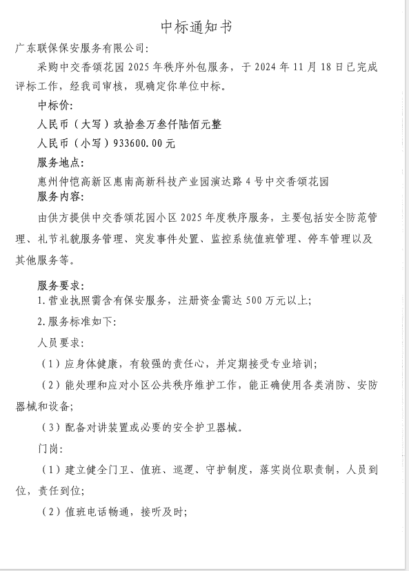 【中標通知】采購中交香頌花園2025年秩序外包服務(wù)