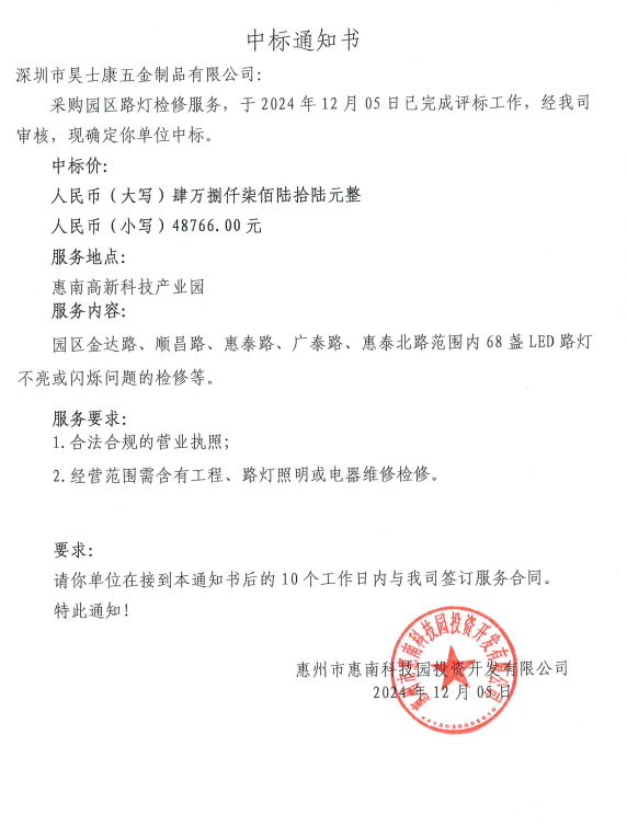 【中標(biāo)通知】采購園區(qū)路燈檢修服務(wù)