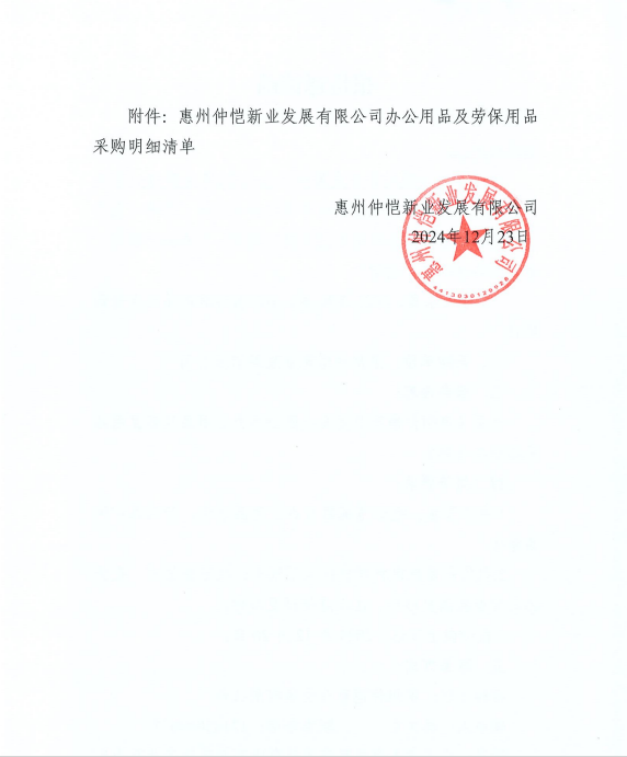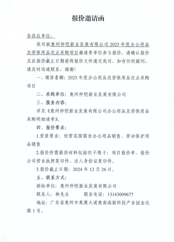 惠州仲愷新業(yè)發(fā)展有限公司2025年度辦公用品及勞保用品定點(diǎn)采購(gòu)報(bào)價(jià)邀請(qǐng)函