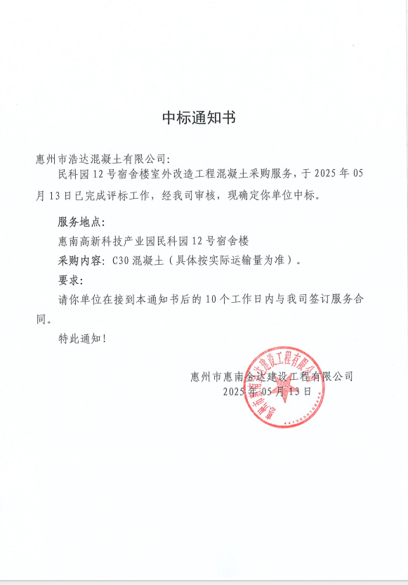 【中標(biāo)通知】民科園12號宿舍樓室外改造工程混凝土采購服務(wù)
