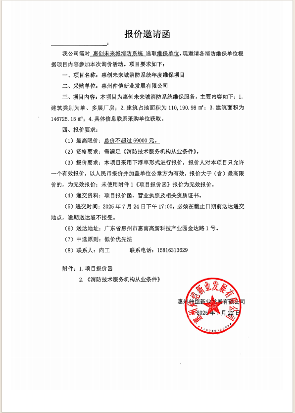 【報(bào)價(jià)邀請(qǐng)函】惠創(chuàng)未來(lái)城消防系統(tǒng)維保服務(wù)