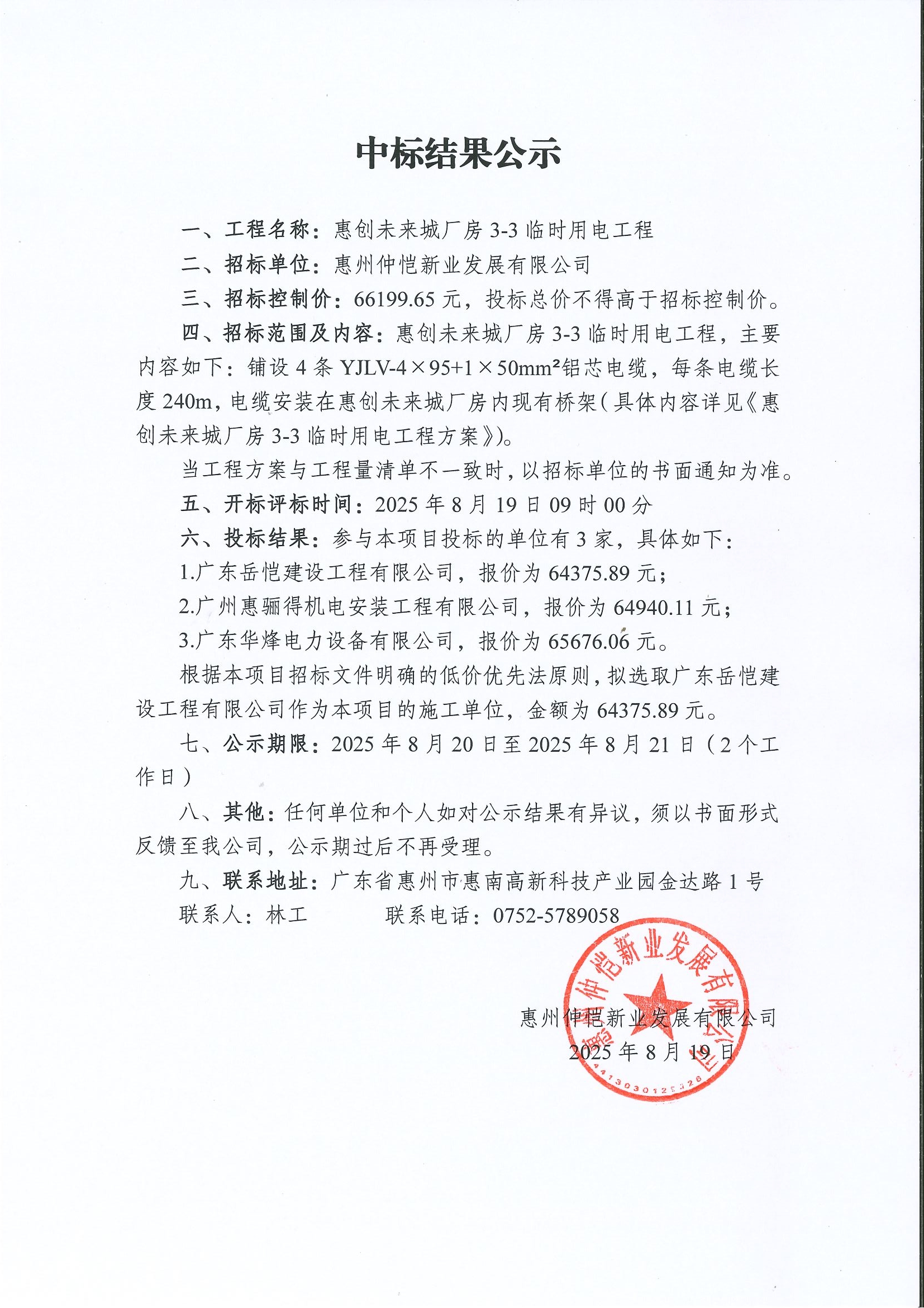【中標(biāo)結(jié)果公示】惠創(chuàng)未來城廠房3-3臨時用電工程