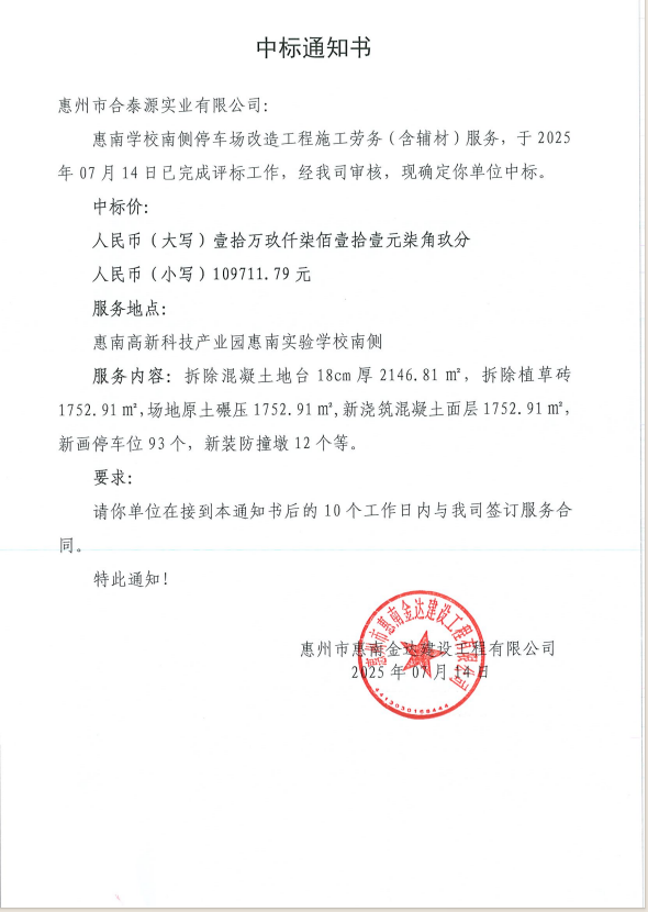 【中標通知】惠南學校南側停車場改造工程施工勞務(含輔材)服務