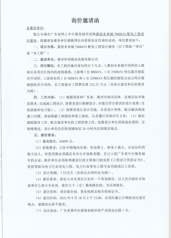 【詢價邀請函】惠創(chuàng)未來城7400kVA配電工程設計服務
