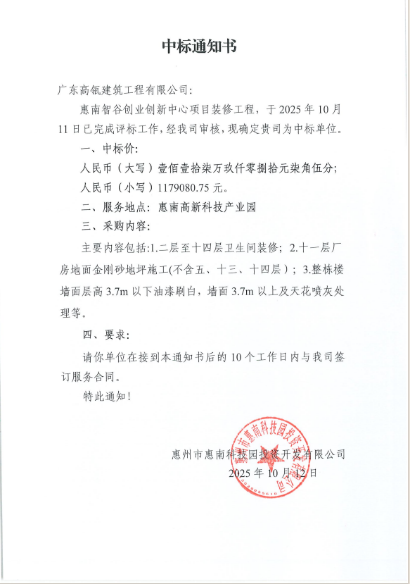 【中標(biāo)通知】惠南智谷創(chuàng)業(yè)創(chuàng)新中心項(xiàng)目裝修工程