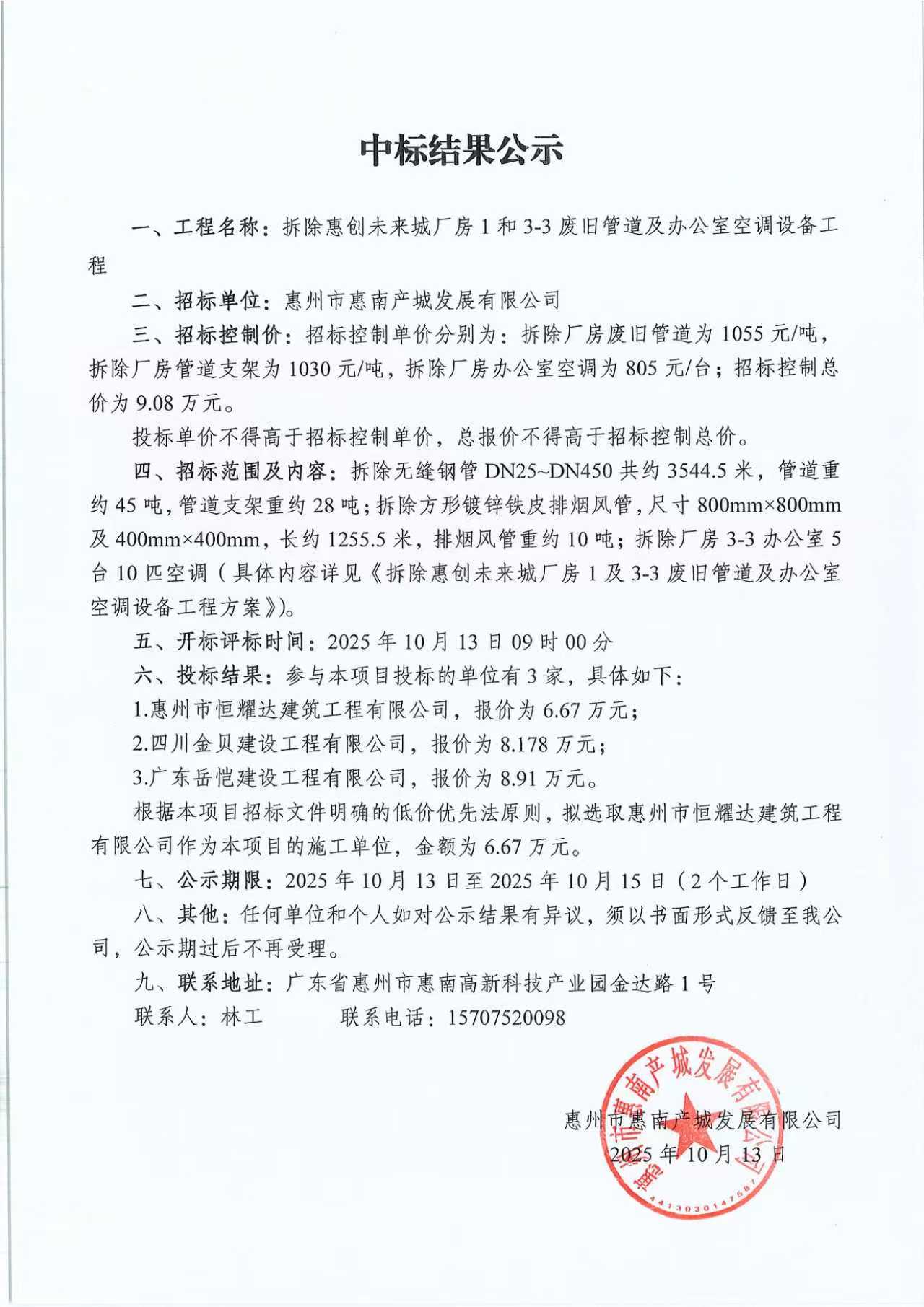 【中標結(jié)果公示】拆除惠創(chuàng)未來城廠房1和3-3廢舊管道及辦公室空調(diào)設備工程