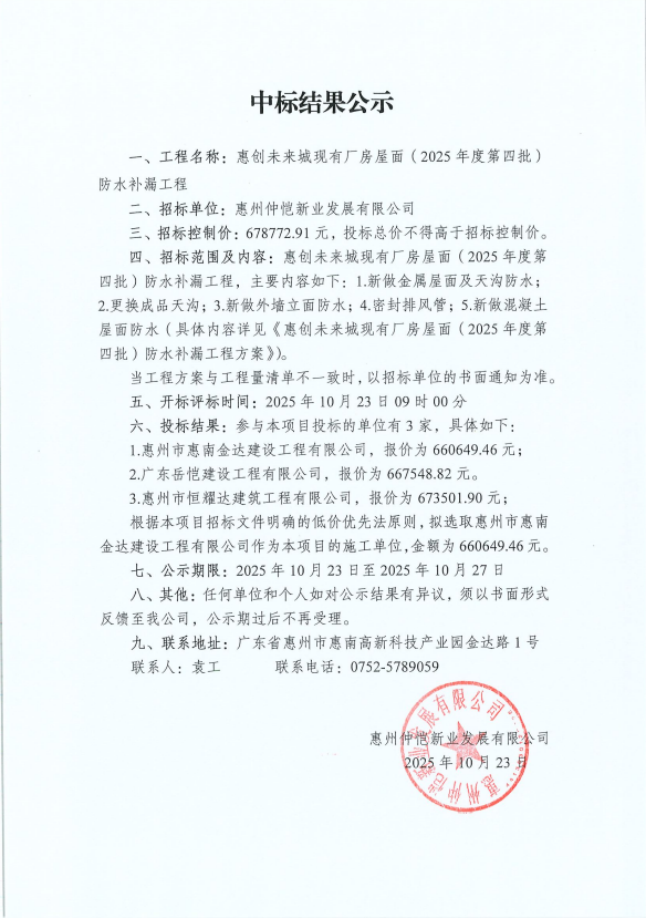 【中標結(jié)果公示】惠創(chuàng)未來城現(xiàn)有廠房屋面(2025年度第四批)防水補漏工程