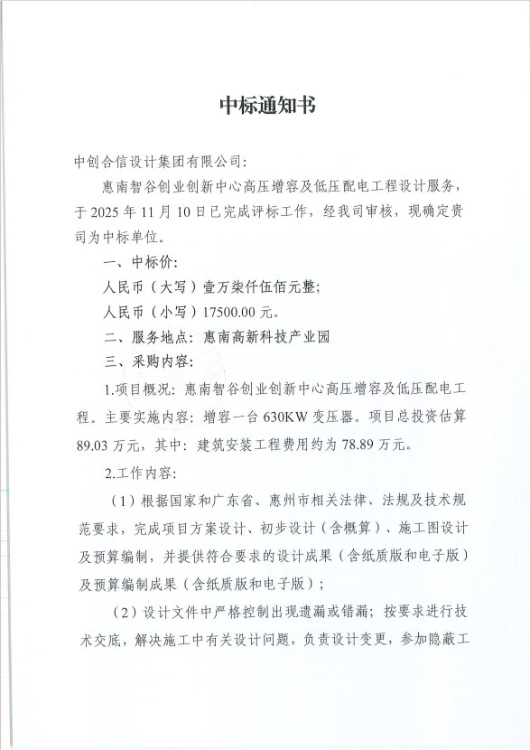 【中標通知】惠南智谷創(chuàng)業(yè)創(chuàng)新中心高壓增容及低壓配電工程設計服務