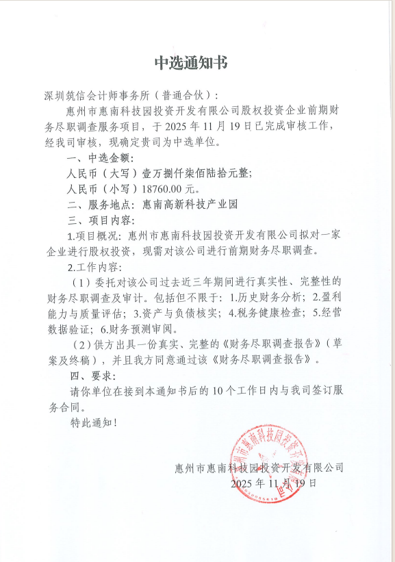 【中選通知】惠州市惠南科技園投資開發(fā)有限公司股權投資企業(yè)前期財務盡職調查服務項目