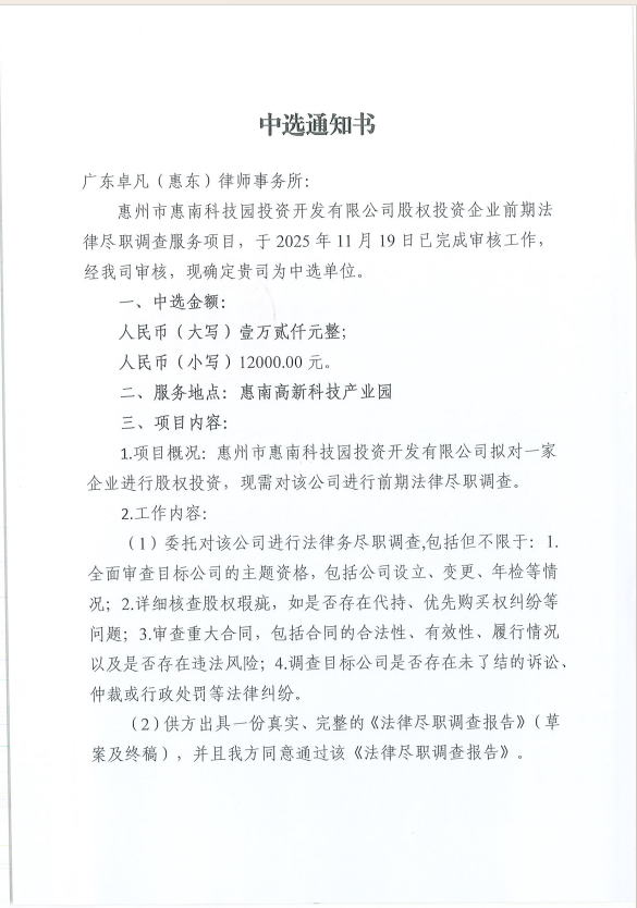 【中選通知】惠州市惠南科技園投資開發(fā)有限公司股權(quán)投資企業(yè)前期法律盡職調(diào)查服務(wù)項(xiàng)目